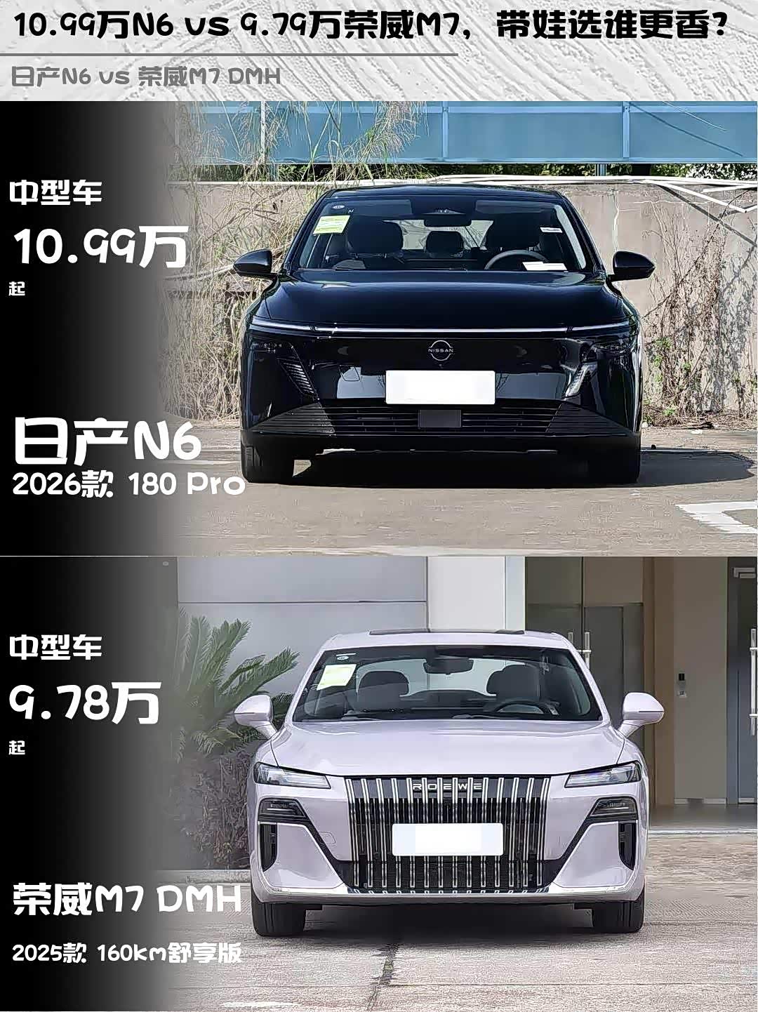 车家号·0浏览·2026-04-09 08:26 · 重庆最近在选插混家轿的朋友看过来!日产N6 2026款 180 Pro和 荣威M7 DMH(参数|询价) 2025款 160km舒享版这两台车我都深度试驾过,分享点干货感受👇