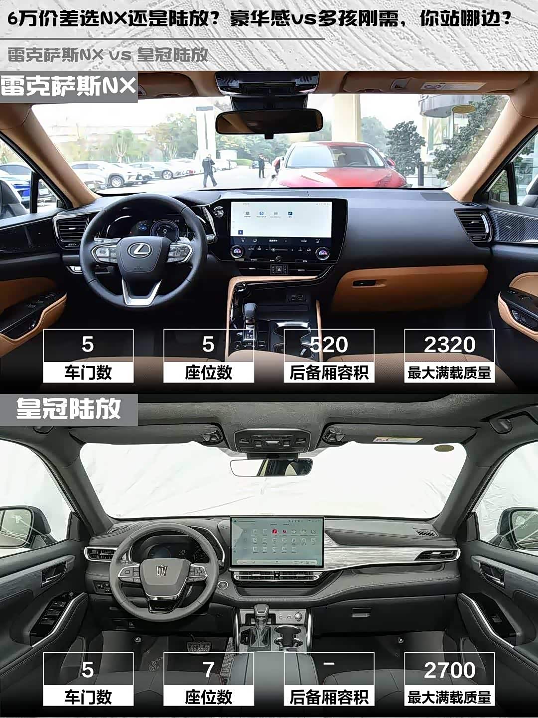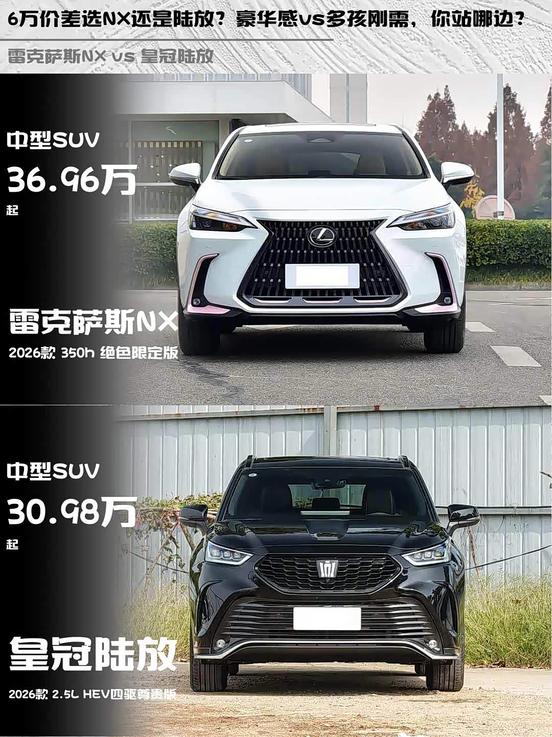 要豪华精致+省心售后选雷克萨斯NX 350h,适合追求设计感和城市通勤的年轻群体;需要大空间+四驱实用性就选皇冠陆放,特别适合经常全家出游的多孩家庭。两台车落地价差6万左右,你们会为品牌溢价买单还是实用主义至上?