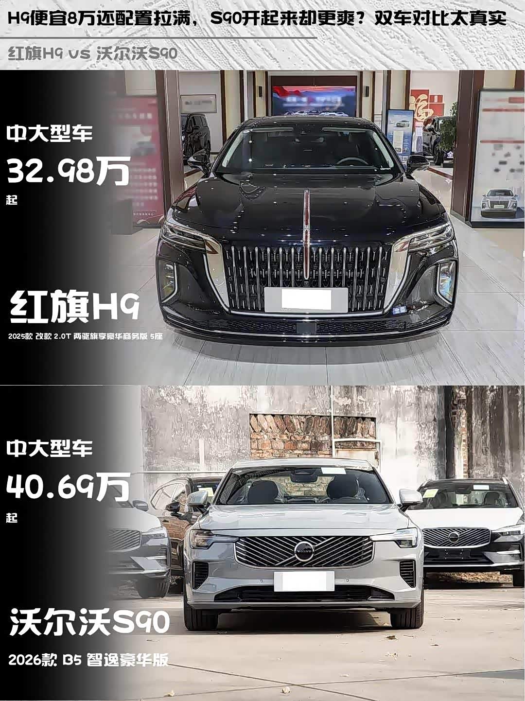 最近深度体验了两台豪华中大型轿车:红旗H9 2025款 改款 2.0T 两驱旗享豪华商务版 5座和 沃尔沃S90(参数|询价) 2026款 B5 智逸豪华版,发现它们完全是两种性格的选手!🤔