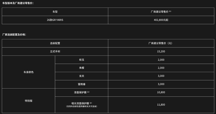 最后,26款GR YARIS原厂还提供了额外一层的车漆防护,消费者可选择为车辆增加一层原厂的隐形车衣或是磨砂车衣,以应对恶劣赛道环境对车漆的侵害,更好的保护爱车。