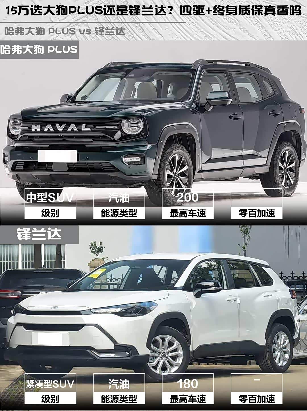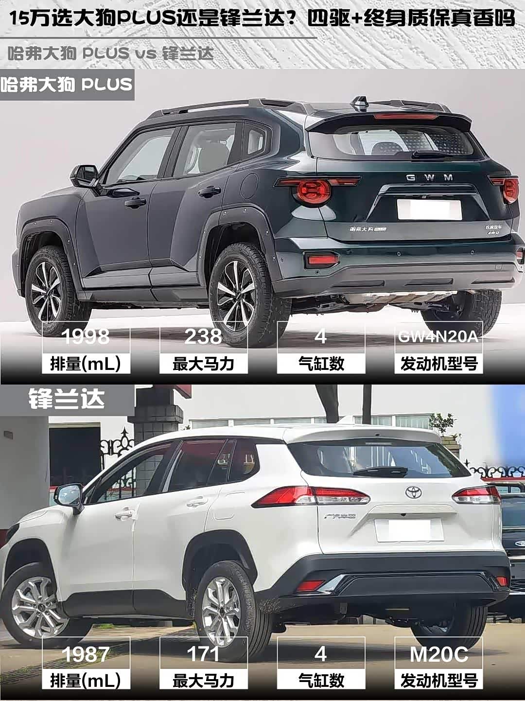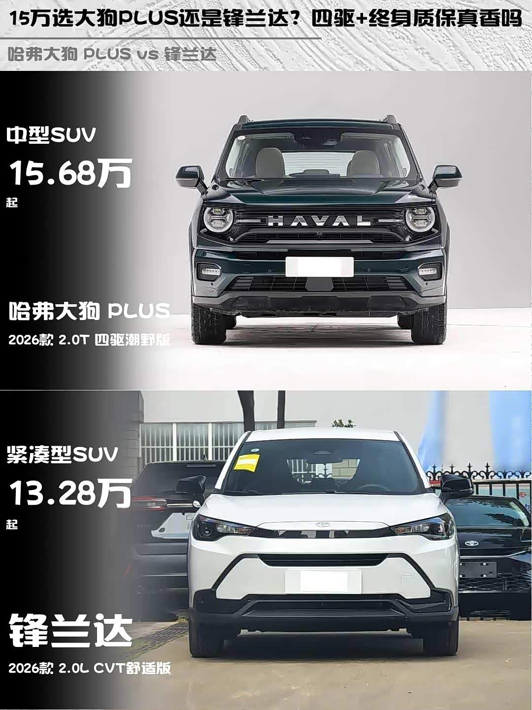 最近在纠结15万级SUV选哪款? 哈弗大狗 PLUS(参数|询价) 2026款 2.0T 四驱潮野版和锋兰达 2026款 2.0L CVT舒适版深度对比来啦!这两款车风格迥异,看完你就知道哪款更适合你~ 🚗💨