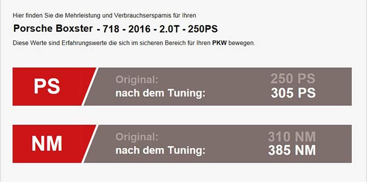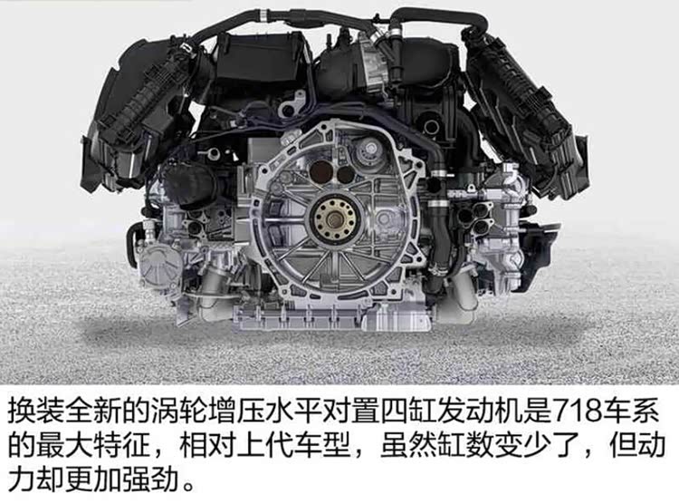 此台718 Boxster搭载的只是一台2.0T水平对置四缸发动机,这台全新的2.0T涡轮增压发动机采用了源于赛道的VTG(可变几何涡轮)涡轮增压技术,显著提升了发动机效能,它的原理就是通过增压器里增加了一个废气旁通阀,可以调节涡轮导流叶片始终对增压器进行控制,来实现最佳效率。当你选择驾驶模式“Sport”和“Sport Plus”时,旁通阀被关闭,点火延迟,节气门也预先开启,这样的结果就是可以让车辆保持扭矩不变,增加发动机的空气量,提高增压压力,提供更高的瞬时扭矩。实际数据最大马力250马力(6500转/分),峰值扭矩310牛•米(1850-5000转/分),与发动机相匹配的是一台7速的PDK双离合变速箱。 对于一款2.0t排量的车型来说,这套动力搭配中规中矩,但对于一款性能跑车来说尤其是同排量AMG 381hp的数据来说,还是有不小的差距,尤其车友更换了全段排气,低速以及急加速动力迟滞更加显著,并且伴随着低档位换挡顿挫的现象,影响了驾驶的乐趣与舒适性,为了能在安全范围内拓展出这款车在国内最佳的动力与操控,一对一定制的刷ecu是个不错的选项。