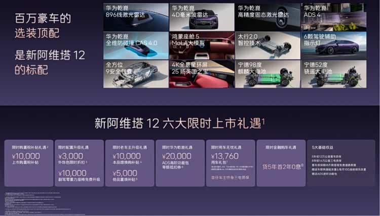 新阿维塔12定位未来智能豪华轿车,面向时代精英人群,主打豪华、智能、旗舰级出行体验。新车全系标配12项顶格配置,涵盖华为乾崑智驾全系统、太行智控2.0、35.4英寸4K全景星环屏、25扬英国之宝音响、全车9安全气囊等,百万豪车顶配选装功能悉数标配。同时推出六大限时购车礼遇,购置税补贴礼遇、配置升级礼遇、老车主升级礼遇、ADS高阶包抵扣权益、贷5年首2年0息金融礼遇、万元用车无忧礼遇,入门即满配,彻底打破豪华门槛。