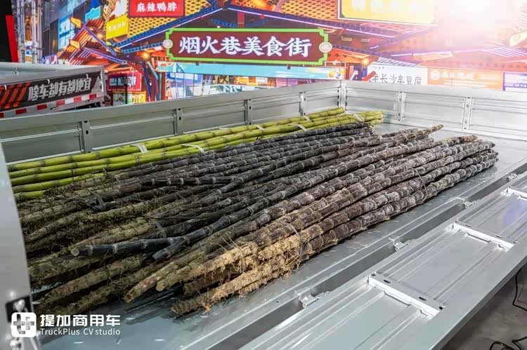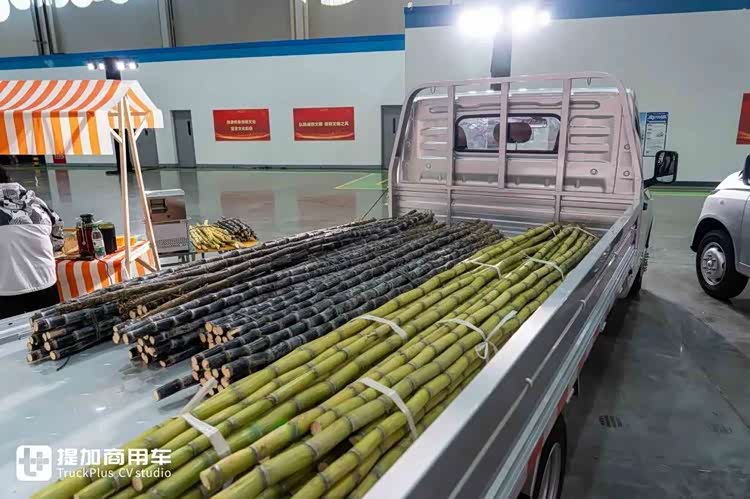 在展示现场,菱势汽车在黄金大卡的货箱中放置了甘蔗。整根长甘蔗可以直接平放在货箱内,不用像传统车型那样斜着搭起来,运输更稳固安全。除了甘蔗,超长的管材也很适用于这一场景。