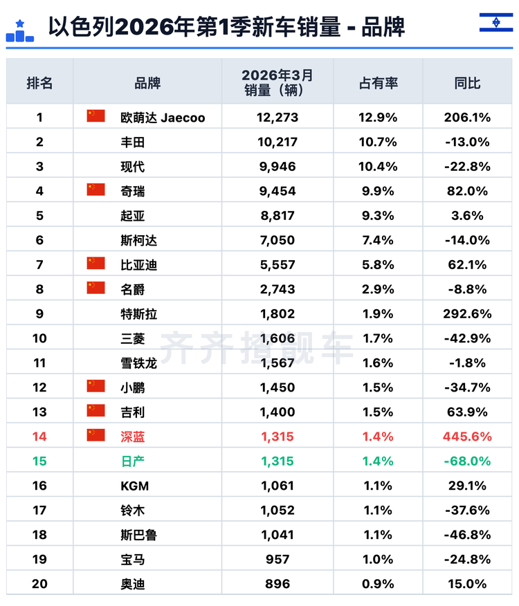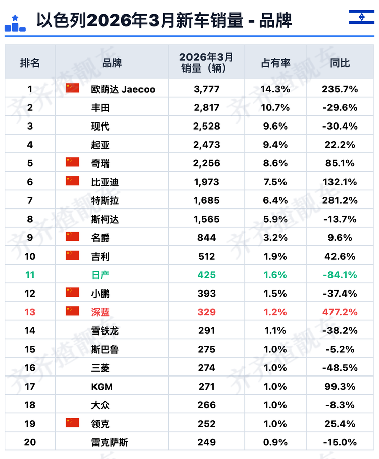 3月,中国品牌在以色列的新车销量同比暴涨90.3%,市场份额从去年同期的19.9%跃升至38.3%。以色列每卖出3辆新车,就有超过1辆来自中国品牌。前十销量榜中,中国品牌占5席,前二十名中则有8席。大部分中国品牌都录得显著增长,相比之下,非中国品牌中逆势上扬的只是少数,跌幅超两成的则比比皆是。