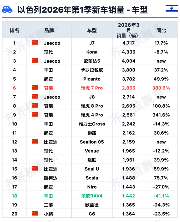 奇瑞系车型对第一季度车型榜的全面主导,是对"中国品牌崛起"是不争的事实。它不靠单一爆款,而是靠完整的产品矩阵,系统性地拿下了以色列消费者的选择。