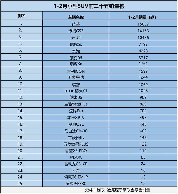 这一扎心数据的背后,是网友消费理念的转变与政策退坡等政策因素的影响。从1-2月小型SUV销量排名前二十五榜单上看到,数据源自乘联会零售销量数据,仅有三款小型SUV销量过万,接下来,看看具体车型排名与销量表现。