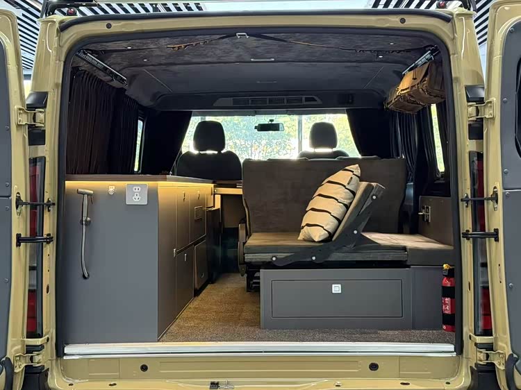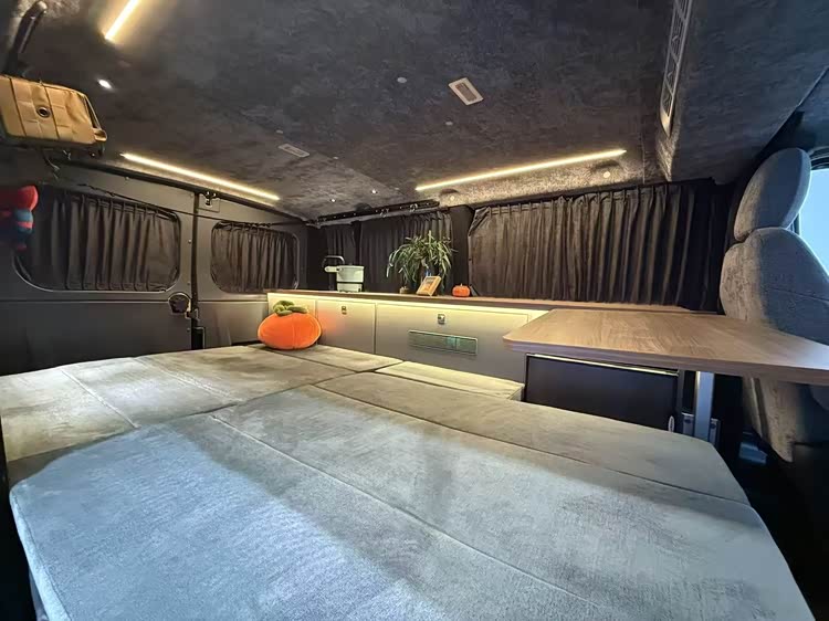 乘坐空间:前排2座+后排2座,副驾座椅可180°旋转,与后排形成对卡座,瞬间变身休闲会客区,朋友小聚、家庭出行都舒适。睡眠空间:后排座椅可一键放平,拼成一张尺寸达2.1m×1.3m的大床,满足2-3人舒适睡眠,旅途休息不再将就。储物空间:全车定制化储物柜,从车顶吊柜到底部抽屉,收纳空间拉满,行李、露营装备、生活用品都能有序安放。细节设计:全车麂皮绒顶包覆+氛围灯,温馨感拉满;全车隐私窗帘,保障休息私密性;定制地毯,提升车内质感。