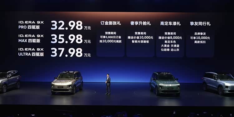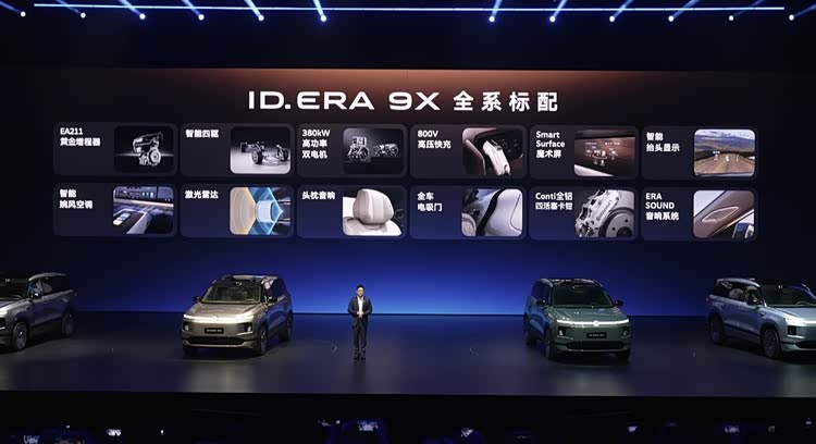 在配置方面,ID. ERA 9X同样毫不吝啬。全系四驱起步,标配副驾零重力座椅、二排右侧动态零重力座椅、主动后轮转向系统、Smart Surface魔术屏、800V高压平台和智能抬头显示等。智能辅助驾驶则搭载最新的Momenta R7强化学习世界模型,支持车位到车位NOA、泊车辅助等功能。