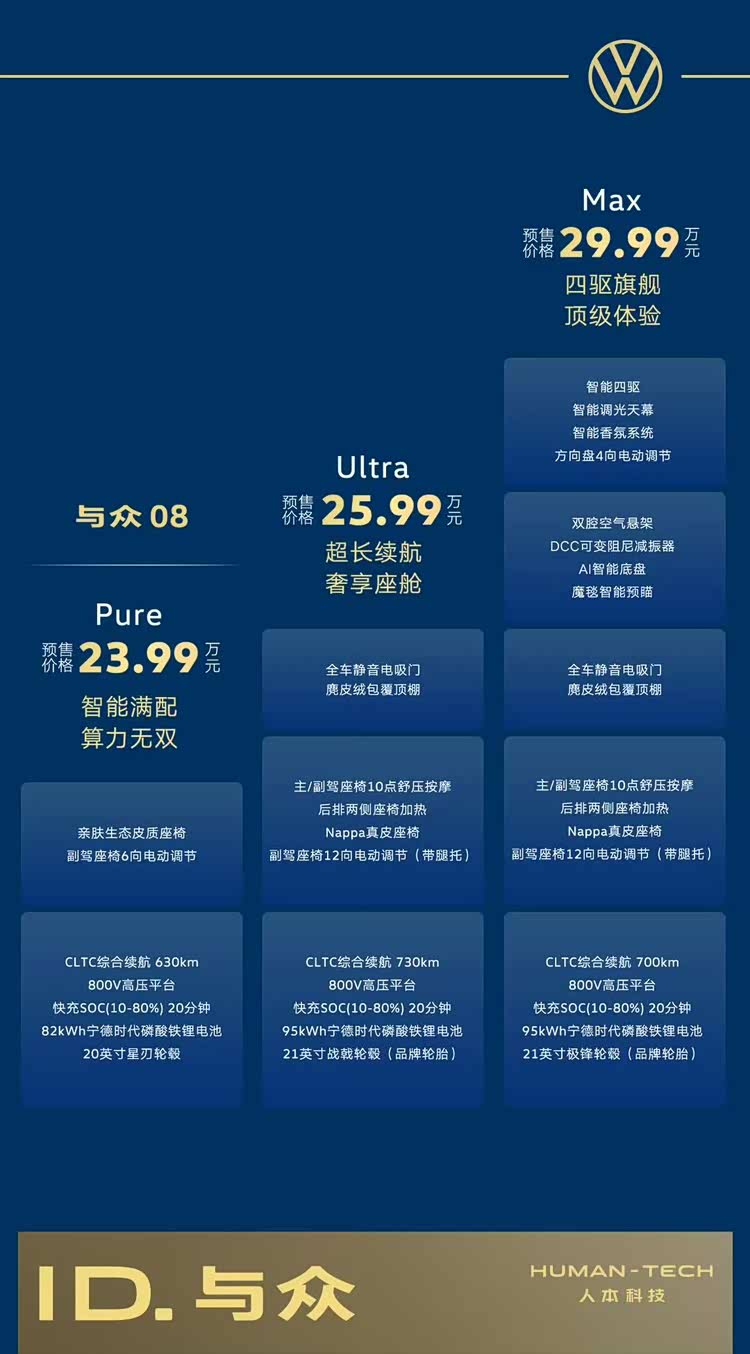 与众08,这是一款“大众底子+小鹏智能”的全新大五座SUV,预售价在23.99万元-29.99万元区间。
