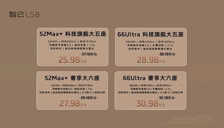 智己LS8全系搭载1.5T增程动力,提供单电机后驱和双电机四驱两种,并基于800V平台打造。其中,后驱版纯电续航可达355km,综合续航为1573km;四驱版纯电续航430km,综合续航为1605km。