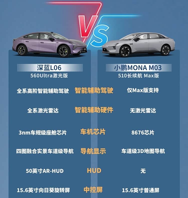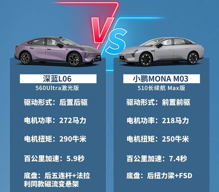 总体来说,小鹏MONA M03在这个级别已经很有竞争力了,无论是动力、空间、配置还是颜值,都值得考量。但是,强中自有强中手,深蓝L06的核心竞争力无疑是更加出色,尤其是续航三电,续航比小鹏MONA M03多了50km,快充时间也快了10分钟,在日常用车中这种差距还是挺明显的。同时,深蓝L06在辅助驾驶部分的表现也很出色,不到11万就有激光雷达,还标配高速/城区领航,加上5秒多的加速和法拉利同款磁流变悬架,可以说是真正意义上的“长续航磁流变激光智能轿跑”,所以说年轻人想要人生第一台纯电动轿跑,那当下的深蓝L06确实是闭眼入都不会错的选择。