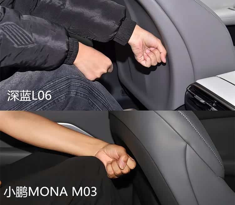 再来看一下小鹏MONA M03,其车身长宽高分别为4780mm、1896mm、1445mm,轴距为2815mm,明显比深蓝L06小一圈,空间比较紧凑,同样的身高坐在后排,膝盖距离前排座椅只有一拳的距离,同时作为一台前驱车,也少了前储物空间,反观深蓝L06可是有100L的前备箱,独立的储存空间也更便利、整洁,可以存放味道重或灰尘大的物品。