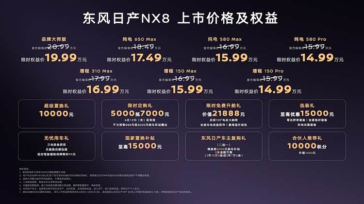 4月8日,东风 日产NX8(参数|询价)共推出7款细分车型,上市限时权益价14.99万-19.99万元。新车全系标配71项高价值配置,在舒适、智能、安全三大维度,实现合资首个“入门即满配”, 让用户选车更省心。新车提供纯电与增程版可选,进一步满足不同消费者需求。