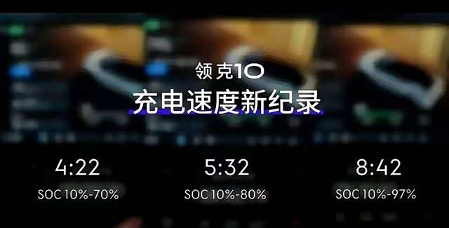 在吉利领克 10 实测 10%→97% 仅需8 分 42 秒,比比亚迪快 2 秒;10%→70% 更是快了 38 秒(4 分 22 秒 vs 5 分钟)。