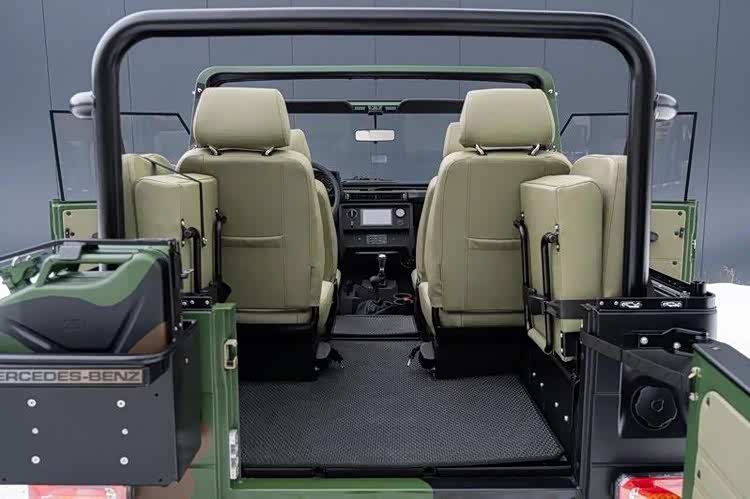 原始军规 Wolf 搭载的是 OM602 2.5 升五缸柴油引擎,最大输出仅 84 匹马力,虽然性能称不上强悍,却以高耐用性闻名。其原厂配置还包括 24 伏特电系、遮光灯具与可向前折叠的挡风玻璃,完全以军事用途为导向,与今日街头常见的豪华 G-Class 有着截然不同的定位。