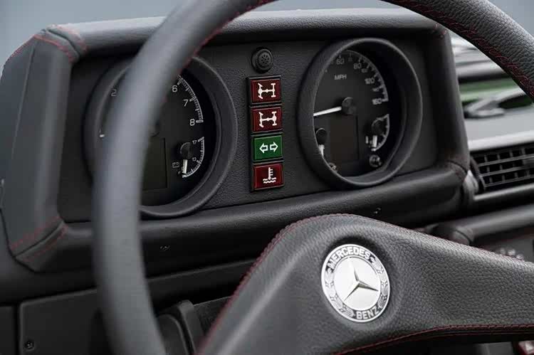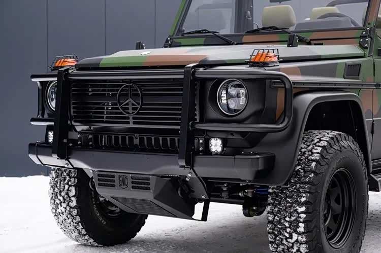 外观方面,这辆 620GE 采用多色迷彩涂装,灵感来自未修复军用 Wolf 的实车研究。由于当年服役车的迷彩多由士兵现地涂装,因此在颜色与分布上本就没有绝对统一标准,EMC 此次特别使用原始绿、棕、黑色漆号重现历史感,并加上黑色防撞杆、Warn 绞盘与涉水套件,强化越野与军用气息。