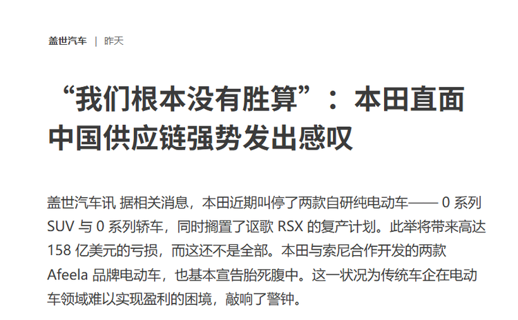 值得注意的是,本田社长兼首席执行官三部敏宏的一番表态引发了行业内外的高度关注。据媒体消息,三部敏宏近期专程前往中国考察,在参观上海一家汽车供应商工厂后坦言:“面对这样的实力,我们根本没有胜算。”