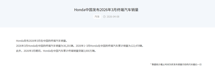 4月8日,本田中国官网发布的数据让行业再度聚焦日系品牌的在华困境。数据显示,2026年3月,本田品牌在中国的终端汽车销量仅为3.62万辆,同比下滑34.34%;一季度累计销量12.25万辆,同比下滑22.4%。