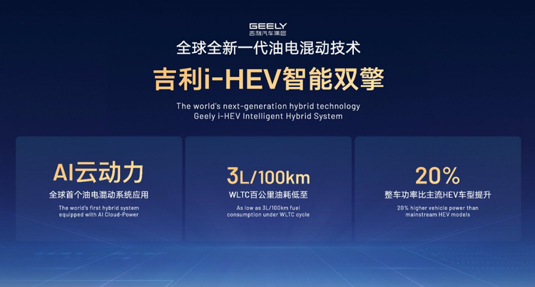 吉利汽车紧随其后,吉利官宣将在2026年上半年发布新一代“i-HEV智能双擎”技术,WLTC工况油耗宣称可降至3L级,更首创“AI云动力”系统,可根据路况和驾驶习惯智能调配动力。吉利同时立下“军令状”:年内推出4-5款全新油混车型,覆盖紧凑型至中型市场。