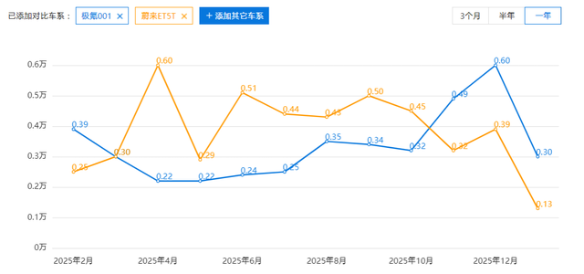 然而好景不长,2024年下半年开始极氪001销量也出现明显下滑,2025年1-11月累计销量仅35,577辆,单月维持在4000-5000辆之间,与峰值相比近乎"腰斩"。同样的“剧情”也发生在蔚来et5t身上。蔚来et5t在2023年6月上市后,凭借实用的空间和蔚来标志性的原创设计美学,当年就卖出2.1万辆,2025年全年销量达5.78万辆,甚至超过同平台亲兄弟et5(2.1倍)。但进入2026年,et5t也出现了增长乏力的局面,1-2月销量环比下降明显。