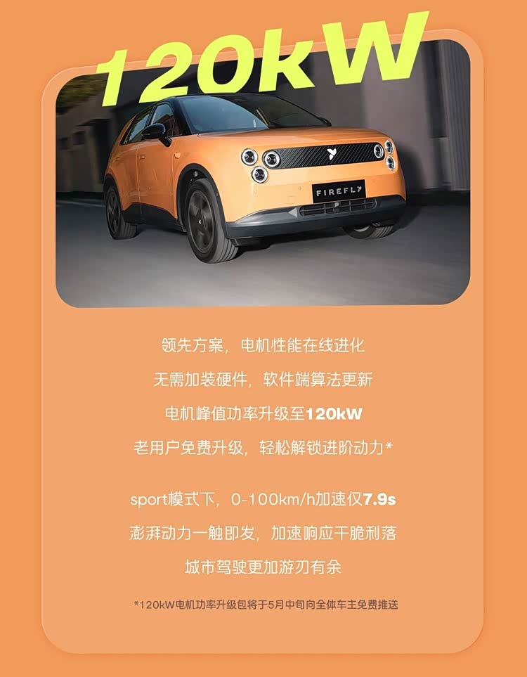 新款萤火虫最大的升级在于动力系统:电机从105kW提升至120kW,零百加速来到7.9秒。这对一台车重不足1.5吨的小型车而言,带来的驾驶体验提升是实实在在的。