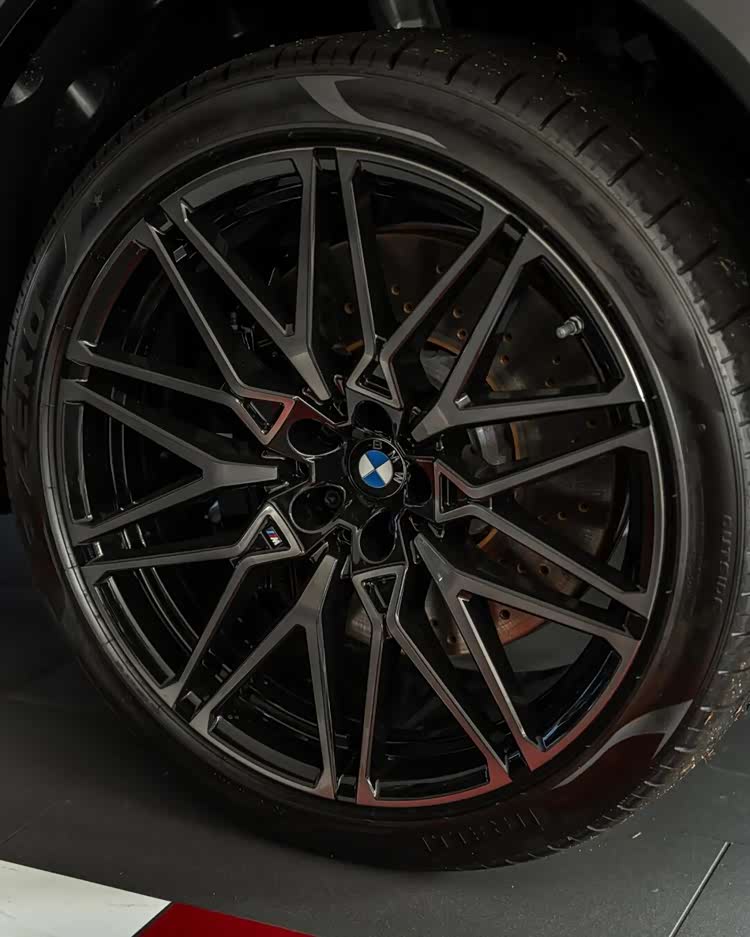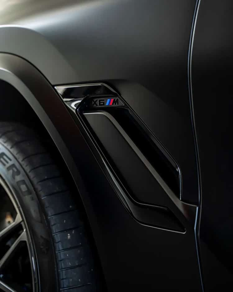 在这一代之前,X5M和X6M的侧翼子处几乎没有啥区别,而这一代F96在这个位置专门做了通风口的造型设计,线条也是和车身下腰线相结合的。这款代号为818M的轮毂看起来相当运动,前21寸后22寸,搭配的是黑色六活塞卡钳、打孔刹车盘以及星标的倍耐力P0轮胎。