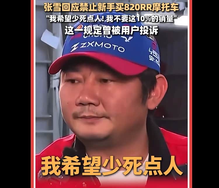 针对此次投诉及整改通知,张雪机车创始人张雪作出明确回应。张雪表示,推出禁售规定的初衷就是保障新手骑行安全,他直言“我希望少死几个人,我不要这10%销售量,公司也不会死”,明确表示会坚持禁售驾龄不满一年者购买820RR车系的规定,不会因投诉和整改通知轻易改变。