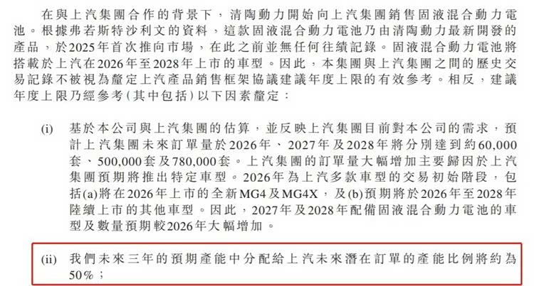 招股书中提到,在与上汽集团的合作背景下,清陶动力开始向上汽集团销售固液混合动力电池,固液混合动力电池将搭载于上汽在2026年至2028年上市的车型。清陶能源根据上汽产品销售框架协议于截至2026年、2027年及2028年12月31日止年度向上汽集团销售产品的建议年度上限分别约为10亿元、50亿元及95亿元。