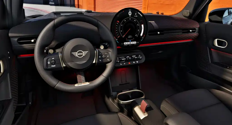 进入车内,可以看到Red Line版直接基于Iconic版本进行扩展,并引入舒适增强套件。座舱采用黑红配色,视觉对比明确,Vescin材质运动座椅加入红色缝线和头枕标识,在触感和支撑性上均有一定优化。方向盘采用JCW风格设计,握径与材质偏向运动取向,在连续转向操作中反馈更直接。
