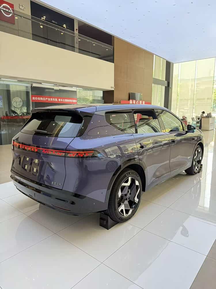 第一眼看到NX8,印象最深的就是它宽大饱满的车头。封闭式前脸是新能源车的常见设计,但一条贯穿车头、长度达到2.4米的星环灯带很有辨识度,中间“NISSAN”字母还能点亮,晚上开出去回头率应该不低。下方是名为“锐鹰之眼”的前大灯,轮廓上依然能看到日产标志性的V-Motion设计元素,配合底部熏黑的梯形下格栅,整个前脸显得很有层次感。