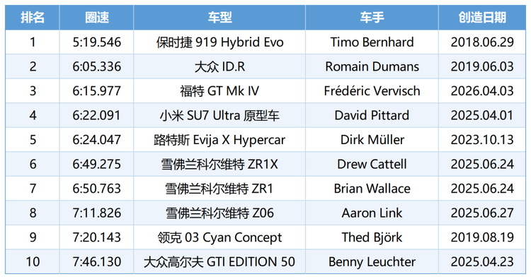 福特GT Mk IV的6分15秒977,是内燃机写给赛道的一封热血情书;而小米SU7 Ultra、梅赛德斯-AMG ONE的亮眼成绩,则预示着汽车工业的未来多元。在纽北的绿色地狱中,速度的较量从未停止,而这,正是汽车文化最迷人的地方。