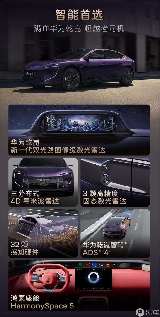智能化方面,新车将会标配华为乾崑ADS驾驶辅助系统,全系标配1个896线激光雷达、3个高精度固态激光雷达、5个毫米波雷达、11个高清摄像头、12个超声波雷达;此外,新车可选装ADS驾驶辅助包,该功能可实现城区车道巡航辅助增强、城区车道领航辅助、车位到车位领航辅助、代客泊车辅助功能。
