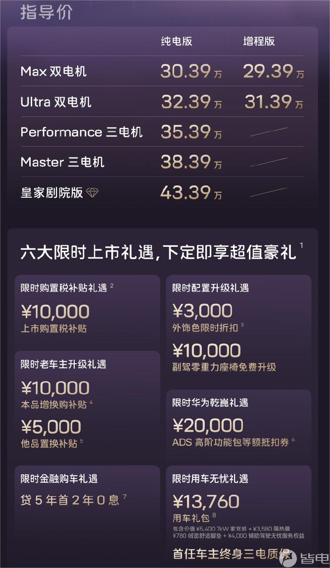 配置方面,新车配备一体式运动座椅,主驾标配零重力座椅功能,副驾零重力座椅为选装配置,前排座椅标配加热/通风/按摩功能(顶配为石墨烯加热);部分配置车型后排还可配备16英寸后舱悬浮天幕屏(豪华影院套装)。