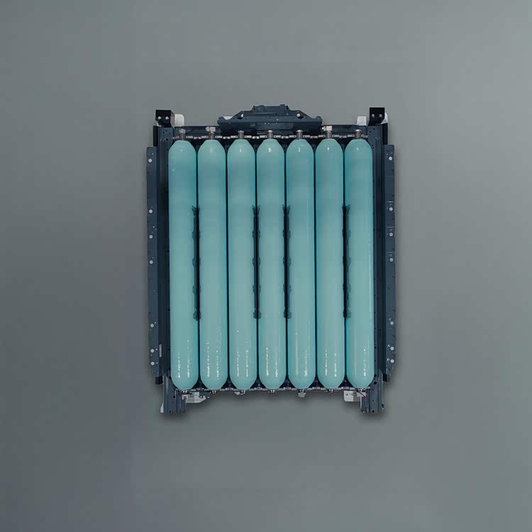 此次发布的核心在于颠覆性的空间利用和生产兼容性。该系统采用七罐并联设计,由七个碳纤维复合材料高压储氢罐集成于金属框架中,形成扁平化密封单元。这一结构优化了底盘空间的同时,还使其占用空间与第六代高压电池相当,实现了与纯电、混动车型的共线生产,提升了工厂产线的灵活性。
