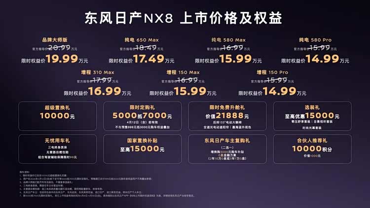 4月8日,东风 日产NX8(参数|询价)在广州正式上市,目前推出限时指导价方案,官方指导价15.99-18.49万元,限时权益价14.99-17.49万元,共推出7款车型。该车型面向家用及多场景出行需求,在空间、动力配置及智能化方面具备相应产品特征。