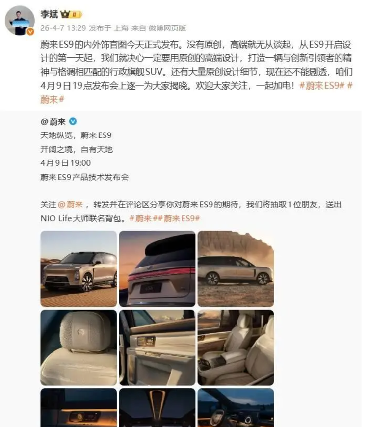 蔚来ES9外观内饰全面公开,4月9日举办技术发布会