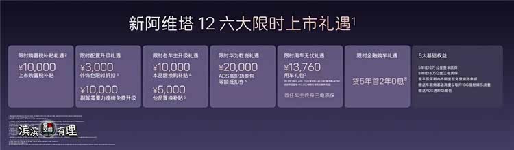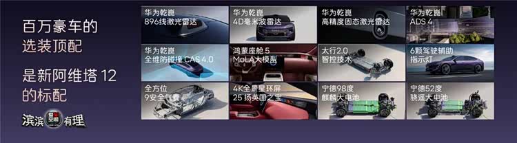 新阿维塔12定位未来智能豪华轿车,面向时代精英人群,主打豪华、智能、旗舰级出行体验。新车全系标配12项顶格配置,涵盖华为乾崑智驾全系统、太行智控2.0、35.4英寸4K全景星环屏、25扬英国之宝音响、全车9安全气囊等,百万豪车顶配选装功能悉数标配。同时推出六大限时购车礼遇,购置税补贴礼遇、配置升级礼遇、老车主升级礼遇、ADS高阶包抵扣权益、贷5年首2年0息金融礼遇、万元用车无忧礼遇,入门即满配,彻底打破豪华门槛。