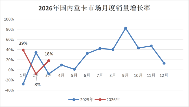 3月重卡市场强势摆脱2月春节淡季影响,同环比双增,迎来旺季全面爆发。其销量的爆发式增长,并非偶然,而是多重利好因素协同发力的结果。首先,春节假期时间差带来需求集中释放,今年春节除夕较2025年推迟19天,2月作为货车购买淡季,大量购车需求被抑制。随着3月上旬元宵节过后,货运行业全面复工复产,车主购车需求集中爆发,复工迫切度高于去年同期,成为推动销量增长的核心动力。其次,车企积极发力冲刺一季度“开门红”,进一步助推销量攀升。此外,出口市场的稳健增长与细分车型的热销,为整体销量提供了有力支撑。