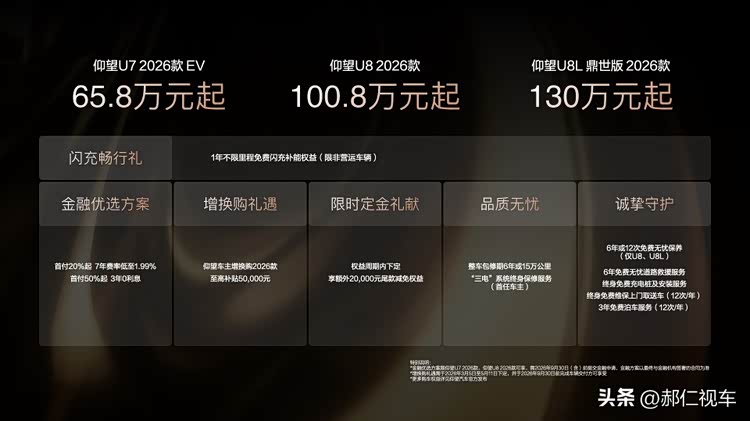 近日,仰望2026款闪充车型陆续抵达全国门店。作为比亚迪第二代刀片电池与闪充技术落地的高端旗舰矩阵,2026款仰望U7、U8、U8L鼎世版以“闪充快、续航远、体验优”为核心标签联袂上市,同步推出的“仰望客户权益升级计划”更从补能到服务全面加码,为用户带来“技术普惠”与“长期关怀”的双重惊喜。