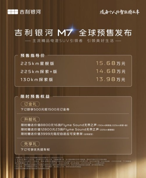 主流精品电混SUV引领者”吉利 银河M7(参数|询价)正式开启全球预售。预售价13.98万元-15.68万元。吉利银河M7本次预售共有订金礼、升舱礼、先享礼三重豪礼相送。预售期间下订用户不仅可享500元抵1500元订金券与优先提车权,全系产品限时免费赠送价值3999元阻尼自适应可变悬架。预售期间,下订130km探索版、225km探索+版的用户,限时免费赠送价值8800元 16扬Flyme Sound无界之声;下订225km星舰版的用户,限时免费赠送价值12800元23扬Flyme Sound无界之声。