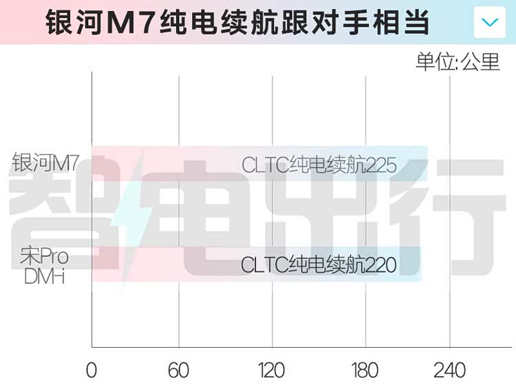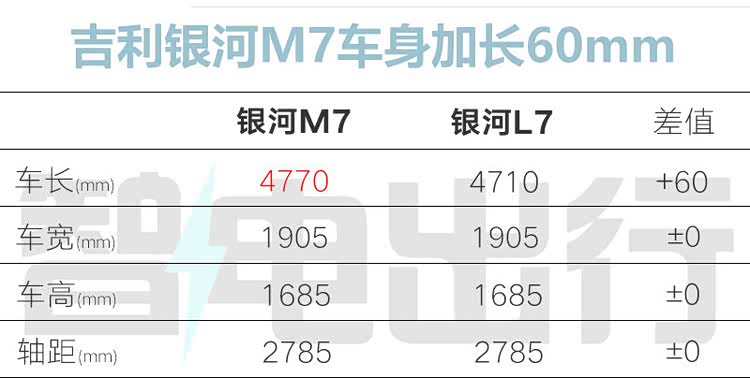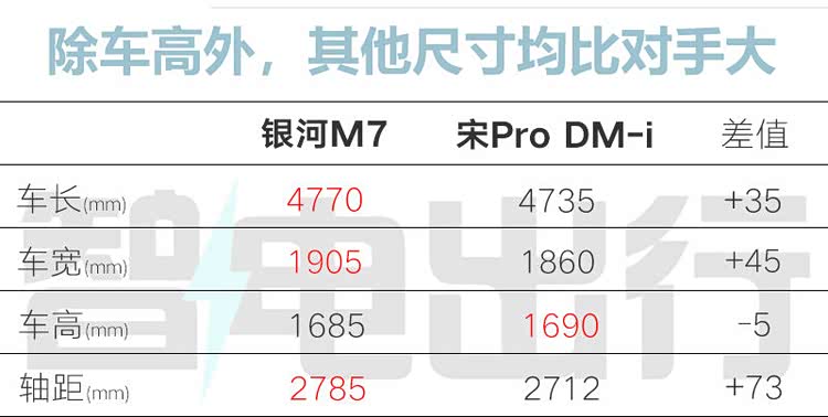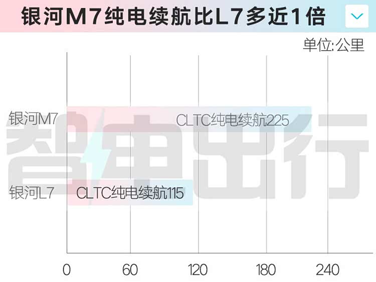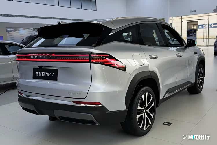 银河M7可看作是银河L7的继任车型。M7定位更高,车长4770mm,比L7长60mm。动力上,M7搭载1.5L雷神插混系统,配备29.8kWh神盾金砖电池,CLTC纯电续航225km,是L7(115km)的近2倍,满油满电综合续航1730km,馈电油耗仅3.35L/100km。