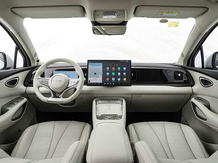 进入车内,新款海狮05 DM-i的内饰同样向纯电版的设计靠拢。中控台采用了全新环抱式布局,中部配有横贯的黑色钢琴烤漆饰板。方向盘改为了三辐平底样式,并换装了电子怀挡,而中央扶手区也进行了重新设计,上方布置了双手机无线充电面板和杯架,下方则为镂空储物空间,提升了前排的储物便利性。中控屏升级为15.6英寸悬浮屏,搭配8.8英寸嵌入式全液晶仪表,构成了车内的智能交互界面,车机系统升级为全新的DiLink系统,在内部功能和交互效率上还有提升。