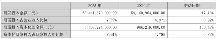 与此同时,该公司研发投入持续加码,全年研发投入达634.41亿元,同比增长17.13%,远超同期净利润。研发投入占营收比重达7.89%,在行业内处于领先水平。