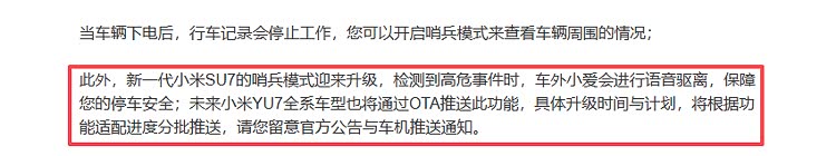 小米YU7全系车型未来也将通过OTA推送此项功能,不过具体的升级时间和计划还未公布。