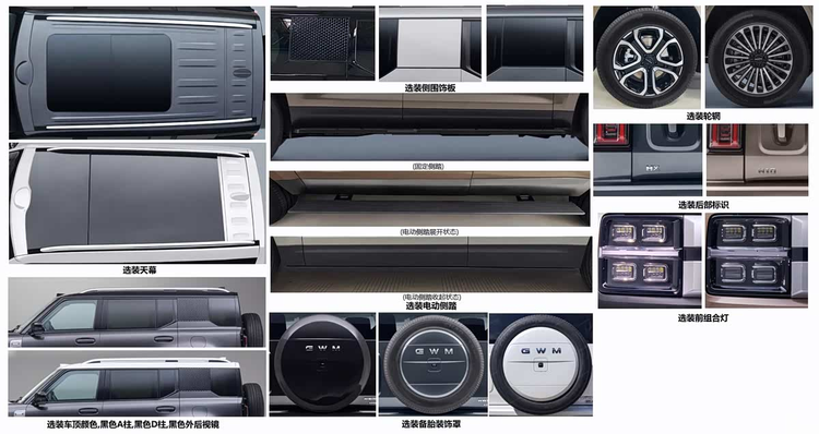 在个性化选择方面,新车提供了较为丰富的选装项目。包括不同样式的天幕、车顶颜色、黑色处理的A柱与D柱、黑色外后视镜、备胎装饰罩、电动侧踏板、多种轮圈样式、后部标识以及前大灯组合等。这些选装配置允许用户根据自己的审美和功能需求,对车辆的外观进行一定程度的定制,以满足不同消费者的个性化偏好。