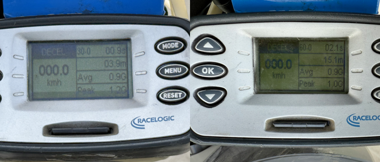 经过多次制动测试,60-0的最好制动成绩为15.1m,30-0的最好成绩为3.9m,这个制动成绩在我们测试过的中大排量车型中位列前三,仅次于自家四缸闪600的14.9米(同人同场地测评),超过很多250-450排量的车型,但个人感觉这套制动系统还没有完全发挥。