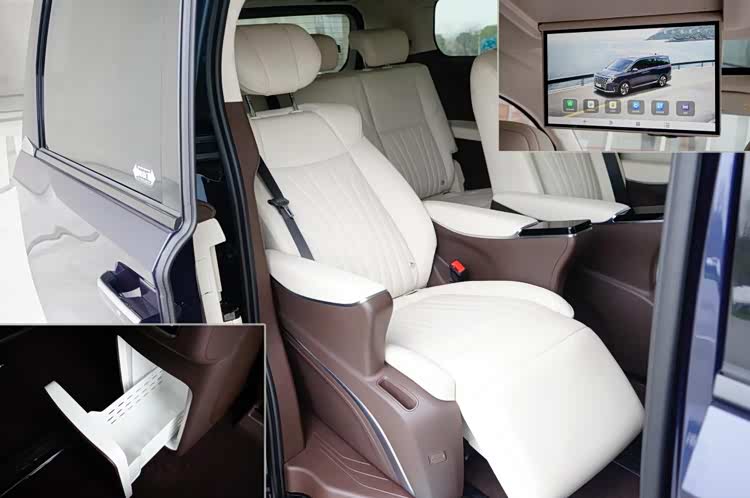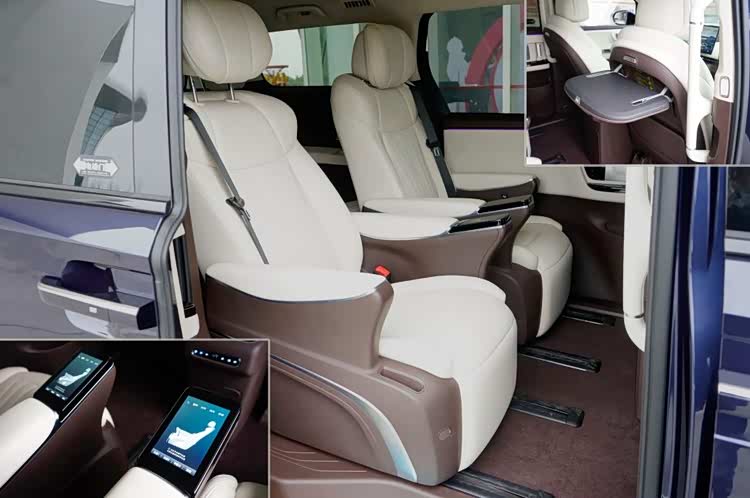 用5英寸车扶手屏来控制所有功能,老板的尊贵感给足了。还有可翻折小桌板和66W快充口,车顶有17.3英寸吸顶屏、地台有车载冷暖冰箱,办公追剧唱K聚餐,这个空间你想干啥都行。另外,这款车也十分注重座舱的空气健康品质,全车都采用低VOC环保材料,内饰气味、过敏原、致癌物等五大健康维度,实测数据远优于国标,甲醛、苯等致癌风险指数仅为限值的1/10甚至0,同时也是首款通过中汽研“中国健康汽车”权威认证的MPV。