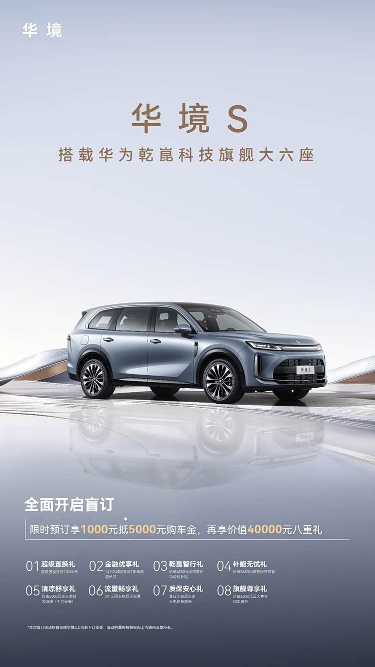 4月7日,华境S全面开启盲订。首先要强调的是,如果现在预订,除了能享受1000元抵5000元的购车金,把车价降的更低一点外,还能叠加价值40000元的专属购车礼,这其中就包括了在乾崑智驾、金融、置换、用车服务等八个方面的福利。这就意味着,如果你想用20万左右预算,买一辆搭载华为乾崑智驾的大六座SUV,品牌和品质同时都有保证的车,那华境S会是你的不二选择。