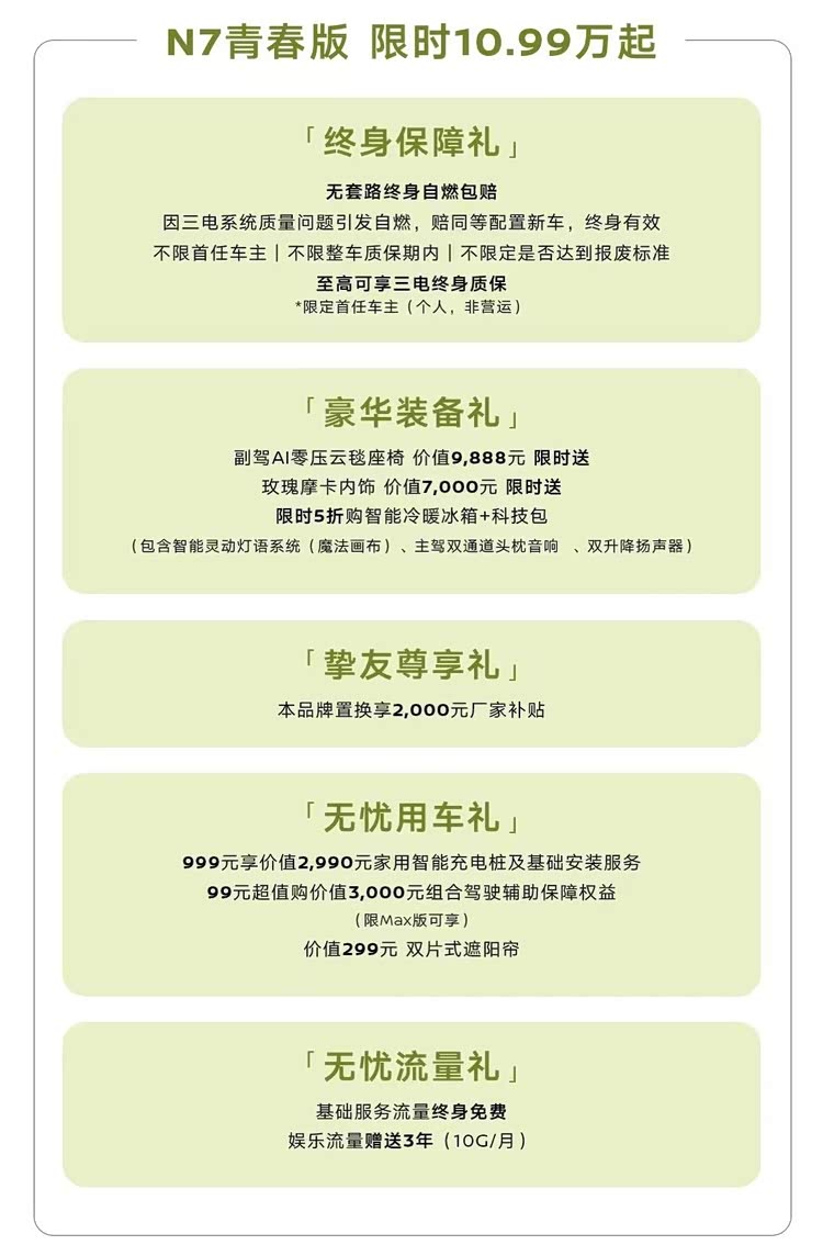 综上所述,N7青春版并非简单的堆料,而是精准地击中了家庭用户“既要舒适体验,又要长期省心”的核心诉求。它以10.99万的门槛,提供了百万级的舒适体验和终身无忧的保障,真正实现了“一次消费,终身受益”。在10万级纯电市场,N7青春版无疑是一匹黑马,它证明了:真正的价值,不在于价格标签,而在于能否真正解决用户的痛点。